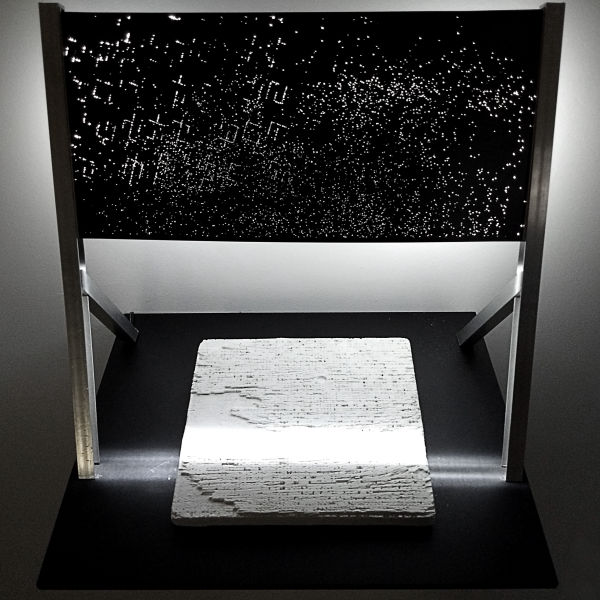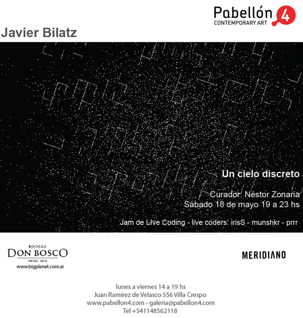 La obra núcleo de esta muestra ("Un cielo discreto”, proyección generativa) busca poner en escena la percepción de un posible cielo estrellado, o el universo todo, de cuyos elementos o estructuras parecen emerger y disolverse textos. Hipótesis: ¿el universo es información? De ser así ¿podemos aprehender algún significado de la misma? Esta obra explora una idea/visión de un universo cuya materia prima es información. Un universo, por lo tanto, discreto."