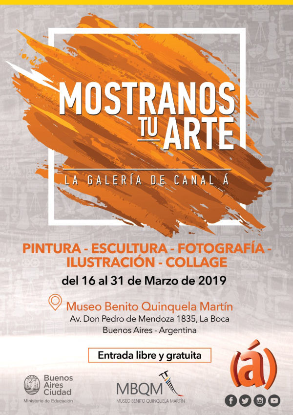 Canal (á), la señal argentina de televisión con más de 20 años de trayectoria, destinada a la difusión del arte y la cultura en general, presentó por primera vez su propia galería. Con el objetivo de exhibir y compartir todas las pinturas, esculturas, fotografías, collage e intervenciones creativas que se realizaron a lo largo del año, MOSTRANOS TU ARTE, la galería de Canal (á) en el Museo Benito Quinquela Martín es la primera exhibición colectiva de este segmento audiovisual.