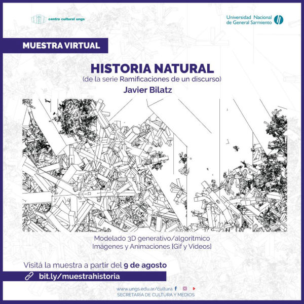 Historia Natural representa una búsqueda estética por medio de algoritmos. Esta muestra exhibe una actual reflexión visual sobre las posibilidades expresivas de los medios tecnológicos contemporáneos. ¿Hasta qué punto las simulaciones que construimos con nuestras máquinas son artificiales? ¿Hasta qué punto nos hemos hibridado con nuestros dispositivos? ¿Somos naturales? Estos paisajes artificiales construidos con instrucciones recursivas y parámetros aleatorios crecen sin control del creador. Surgen con unas condiciones iniciales para generar en cada iteración nuevas configuraciones. En términos de Javier Bilatz “En esta serie ‘Ramificaciones de un discurso’, comencé a ejercitar algunos conceptos recursivos y, para mi sorpresa, me tropecé con una transición de pasos discretos, que parece ir de lo natural a lo artificial (a lo urbano/circuito/procesador)”. Sujetos a las sorpresas que nos pueden deparar nuestros artefactos contemplamos el paisaje natural/artificial que nos ofrecen.